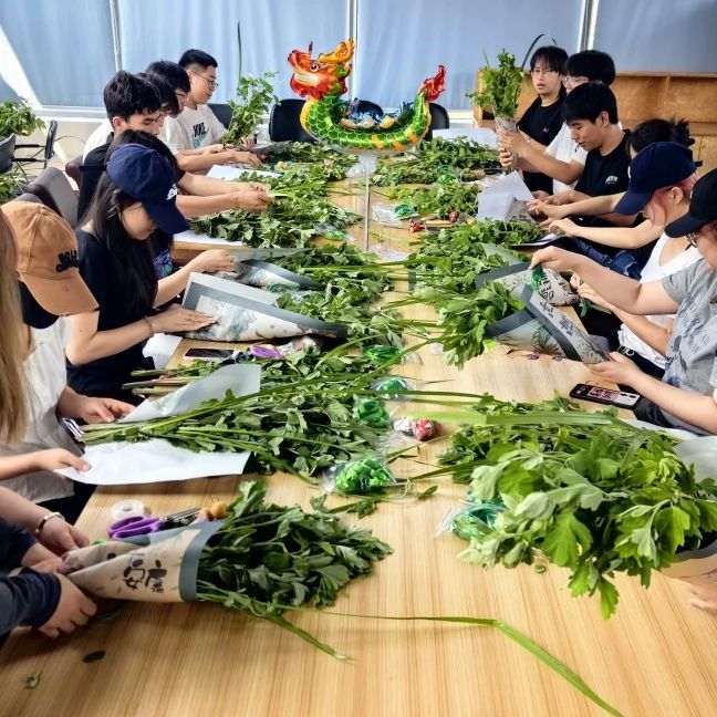 花艺老师带领学生用马蔺草编制端午门挂,讲解马蔺草“耐旱耐贫瘠、象征坚韧品格”的特性——正如身处逆境却自强奋进的受助学生群体,历经生活磨砺,始终心怀梦想、矢志奋斗。师生实践互动中,中华传统文化中坚韧自强的精神,与青年学子面对困境的成长感悟相互交融。这堂生动的劳动与传统文化课,让家国情怀的种子在青年心中悄然萌发,化为前行的力量。
