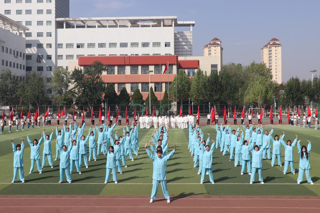 入场式后,随着舒缓悠扬的音乐响起,参与八段锦展演的教师们身着统一天蓝色练功服,迈着整齐的步伐有序入场。他们个个精神饱满、气定神闲,以挺拔的身姿和专注的神情,吸引了现场师生的目光。他们动作整齐划一,举手投足间尽显八段锦的独特魅力。动作行云流水般流畅自然,又不失力度与韵味,充分展现了八段锦 “圆活连贯、动静相兼” 的特点。