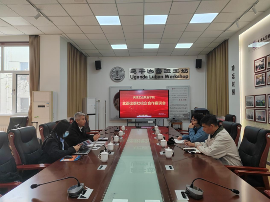 座谈中,北京语言大学出版社有限公司卢荻秋首先介绍了北语社的基本情况,业务包括教材出版、国际合作等,正在转型教育数字化建设,出版的《HSK标准教程》《发展汉语》等教材被全国各院校及全世界各孔子学院采用;薛菲组长现场展示了其数字化资源的构成及使用。刘红主任和梁国勇副主任介绍了学院乌干达鲁班工坊的专业建设、留学生,以及学院今年要开展的国际中文培训和中文+职业技能培训情况,提出学院目前对职业教育国际化教学资源建设的需求。