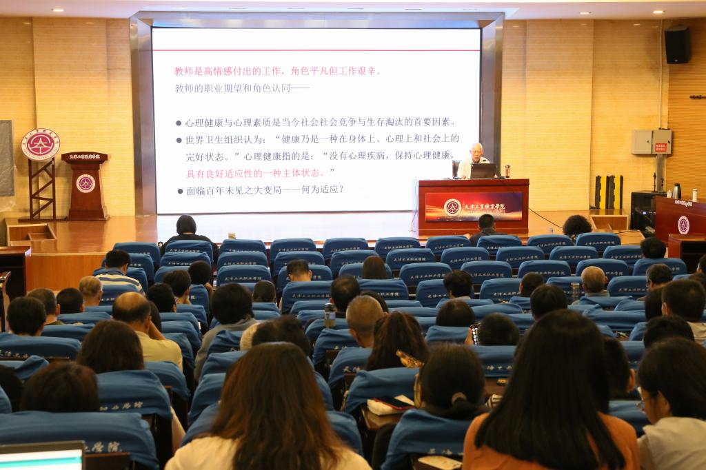 刘援朝教授从“教师是高情感付出的工作、提高心智化水平促进自我成长、关心学生成长前置危机干预、积极心理调适提高工作效能”四个方面为广大教职工讲解和疏导。针对教师普遍出现的心理危机和心理疾病,如何积极心理调适,提高工作效能和生活质量,刘教授提供了合理情绪心理调节方法。他鼓励教师强化角色意识、培养工作兴趣和生活爱好,完善自己的心理支持系统,使教师更加成熟、从容、坚定地面对工作和生活。