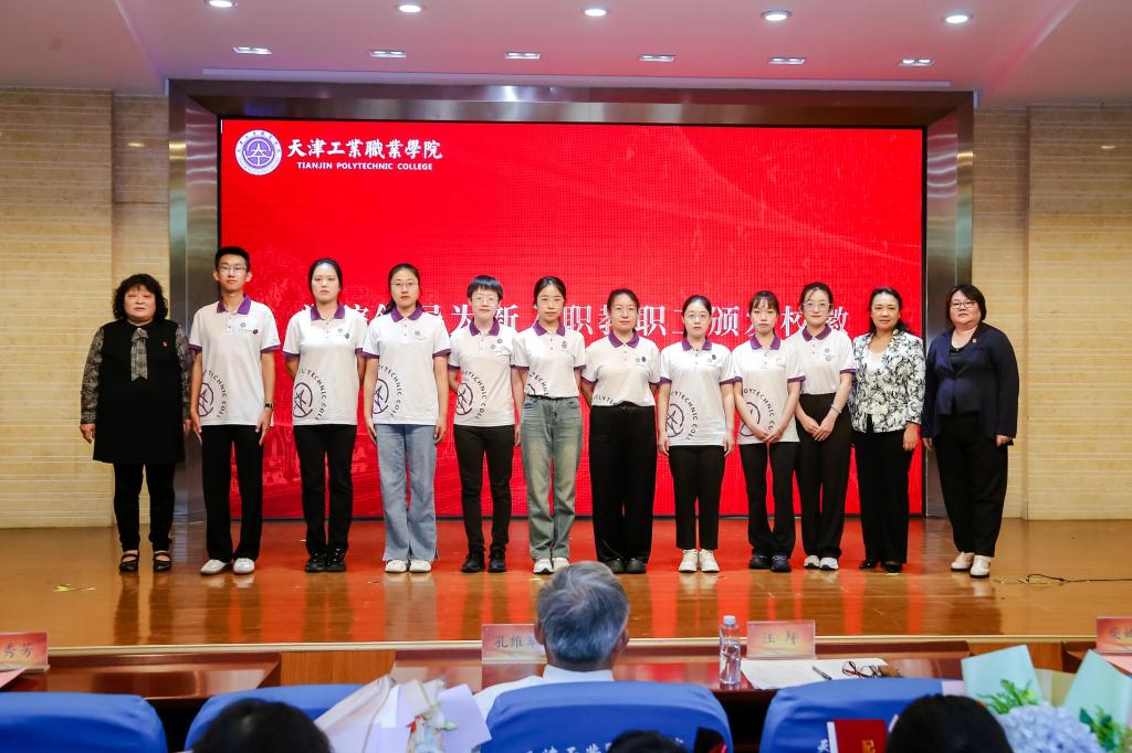 党委书记汪坪、党委副书记柴娜娜、副院长张秀芳共同为2024年新入职教师颁发校徽
