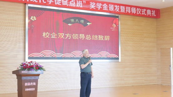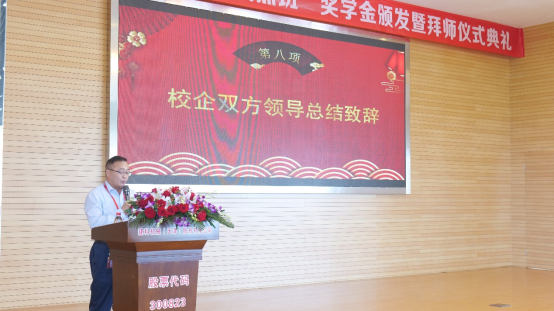 建科机械张新常务副总经理对学校领导的全程参与和大力支持表示衷心的感谢。对校企合作导师的精心育人提出表扬,对校企各部门领导的通力合作和有效协调给予充分肯定,并表示今后企方将加大经济投入并优化奖励机制,积极参与产学研合作,拓宽校企合作途径,为社会输送更多高质量、高素质技术技能人才。