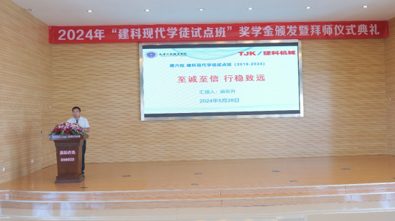 自2019年以来,机械工程系与建科机械共同探索校企合作特色育人方式,试点班举办六年来硕果累累,企业为机械工程系颁发了“校企合作先进团队奖”,孔维军院长上台领奖并发表获奖感言,孔院长表示今天颁发的奖项意义非凡,是企业对学院工作的肯定,是我们携手走过6年成绩的见证,未来的职业教育办学中心工作就是“产教融合”,希望校企双方继续坚持“至诚至信”的理念,携手共赢未来。