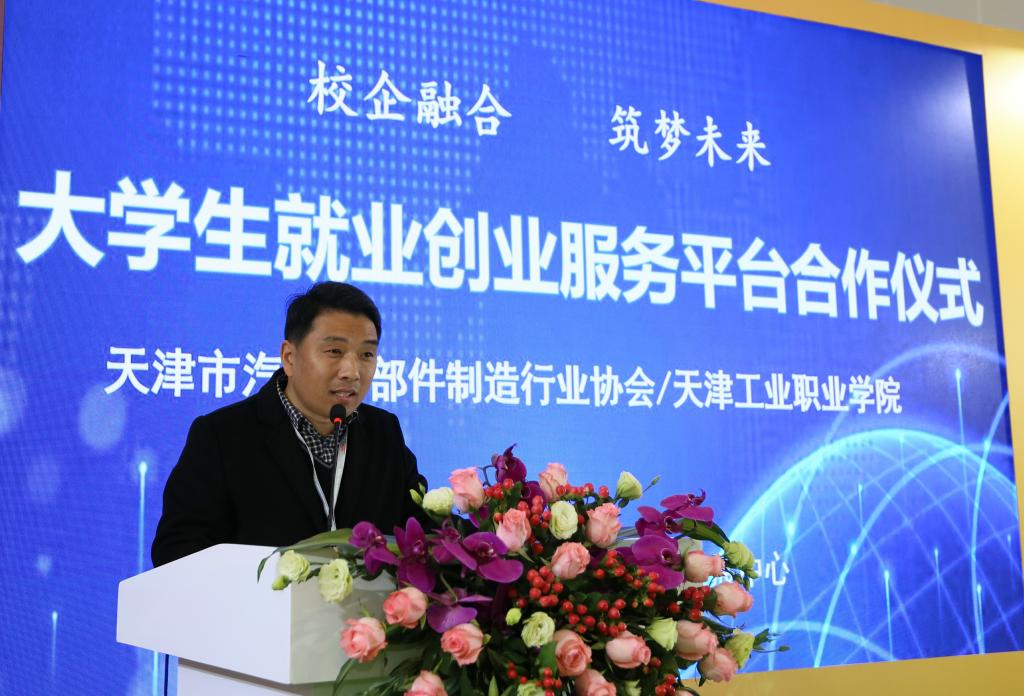 天津市汽车零部件制造行业协会党支部副书记郭俊峰致辞,他希望通过共同努力,在校企协同育人方面结出丰硕的成果,为中国汽车工业输出更多高素质的人才。
