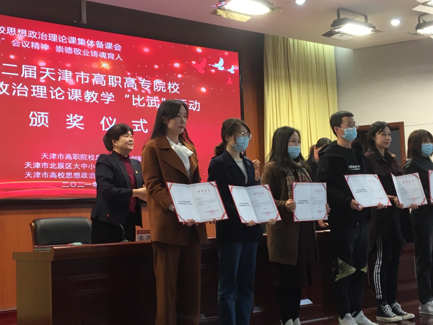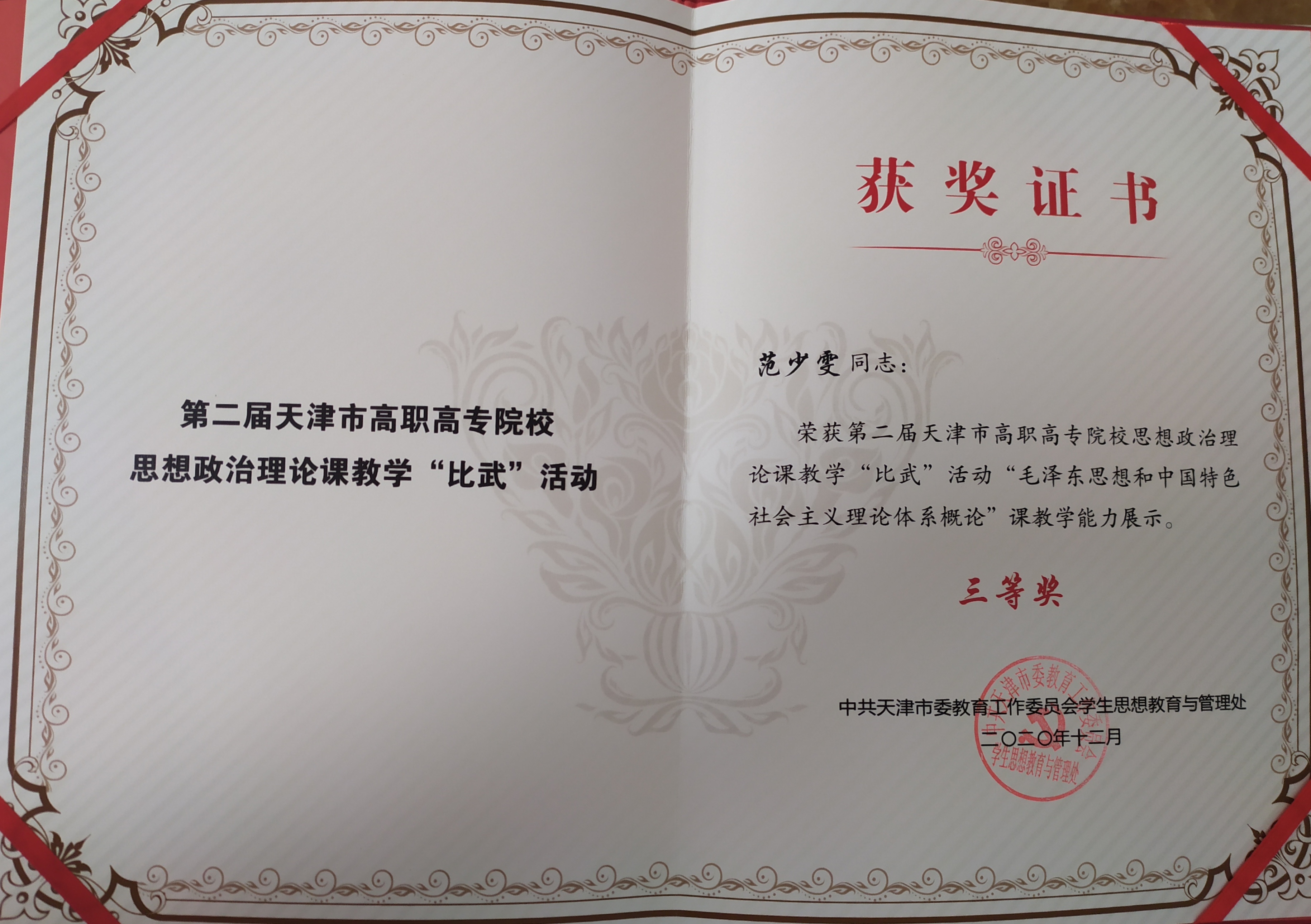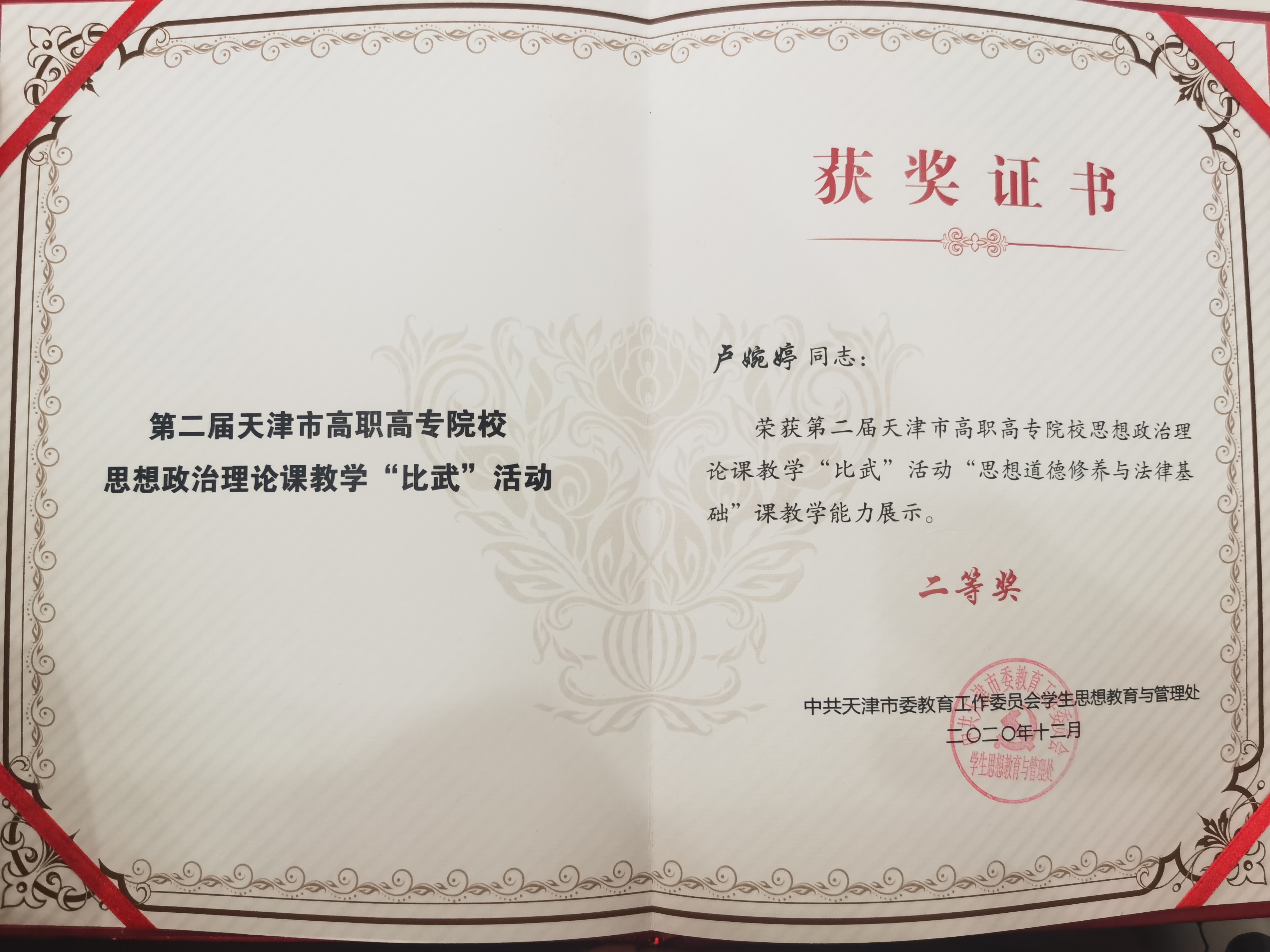 第二届天津市高职高专院校思想政治理论课教学“比武”能力展示颁奖活动于2021年3月21日在天津城市建设管理职业技术学院举行。思政课部的卢婉婷老师荣获“思想道修养与法律基础”教学能力展示二等奖第一名;范少雯老师荣获“毛泽东思想和中国特色社会主义理论体系概论”课教学能力展示三等奖。