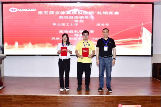 随后进入大赛闭幕式,本届大赛共评选出炼钢单项奖17名,轧钢单项奖16名,团体奖6名,大赛突出贡献奖2名。京津冀三地金属学会和学院领导出席大赛闭幕式并为获奖团体和个人颁奖。我院选手在本次大赛中表现出色,分别斩获了高校组团体一等奖和轧钢单项一等奖,学院获得大赛突出贡献奖。