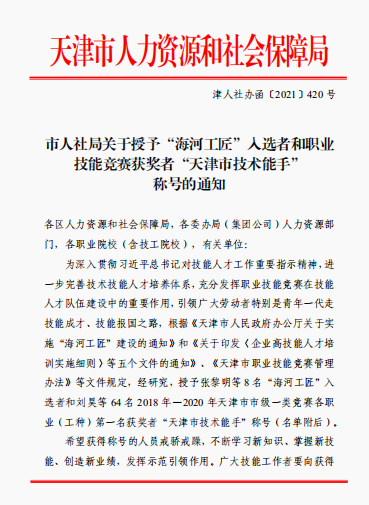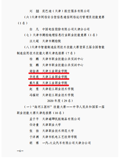近日,天津市人社局授予2018年-2020年天津市市级一类竞赛各职业(工种)第一名获奖者“天津市技术能手”称号。我院机械工程系谢金涛、李连亮、戴冬晨三名老师以2019年天津市智能制造应用技术技能大赛暨第三届全国智能制造应用技术技能大赛天津选拔赛第一名的成绩获此称号。