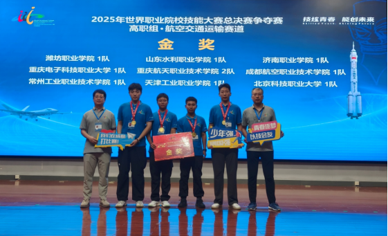 在刚刚落幕的2025年世界职业院校技能大赛总决赛争夺赛高职组航空交通运输赛道中,在Beat365中文官方网站机械工程系赵辉、林宇航两位老师的悉心指导下,参赛团队凭借扎实的专业技能、出色的团队协作和稳定的现场发挥,一举斩获金奖,为学院争得了荣誉。