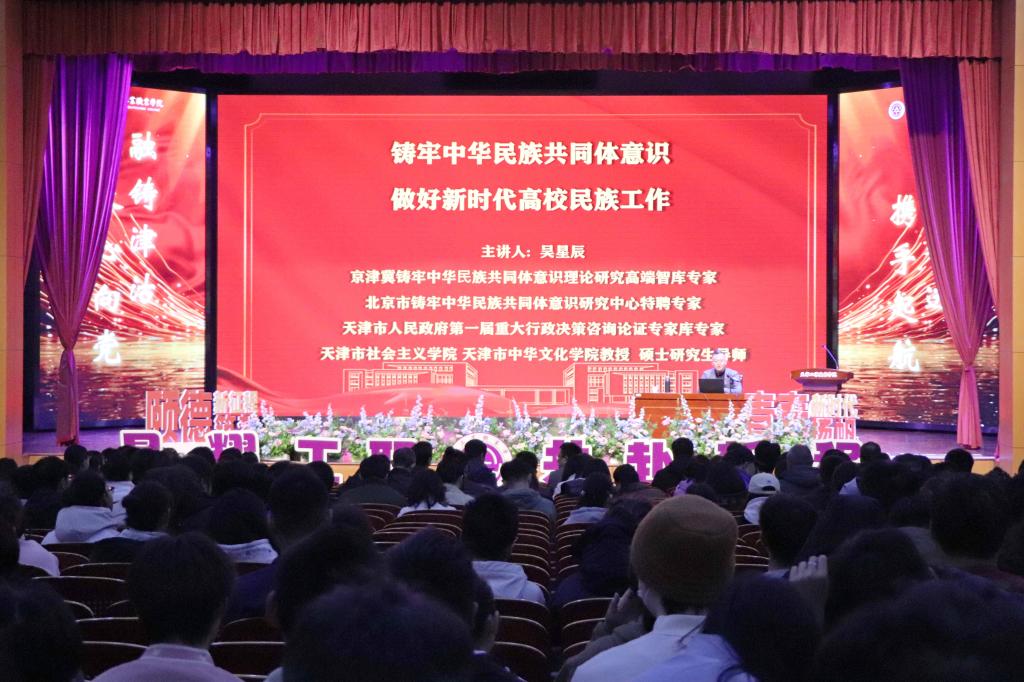 为深入贯彻党的二十大和二十届历次全会精神,学深悟透习近平总书记关于加强和改进民族工作的重要思想及重要指示批示精神,根据《教育部等十一部门关于加强学校铸牢中华民族共同体意识教育的指导意见》等有关文件部署要求,充分发挥学校教育在铸牢中华民族共同体意识工作方面的重要作用,117,学校党委统战部邀请天津市社会主义学院吴星辰教授以《铸牢中华民族共同体意识,做好新时代高校民族工作》为主题开展讲座,各党支部书记、统战委员、全体辅导员、教职工代表及部分学生代表参加学习。