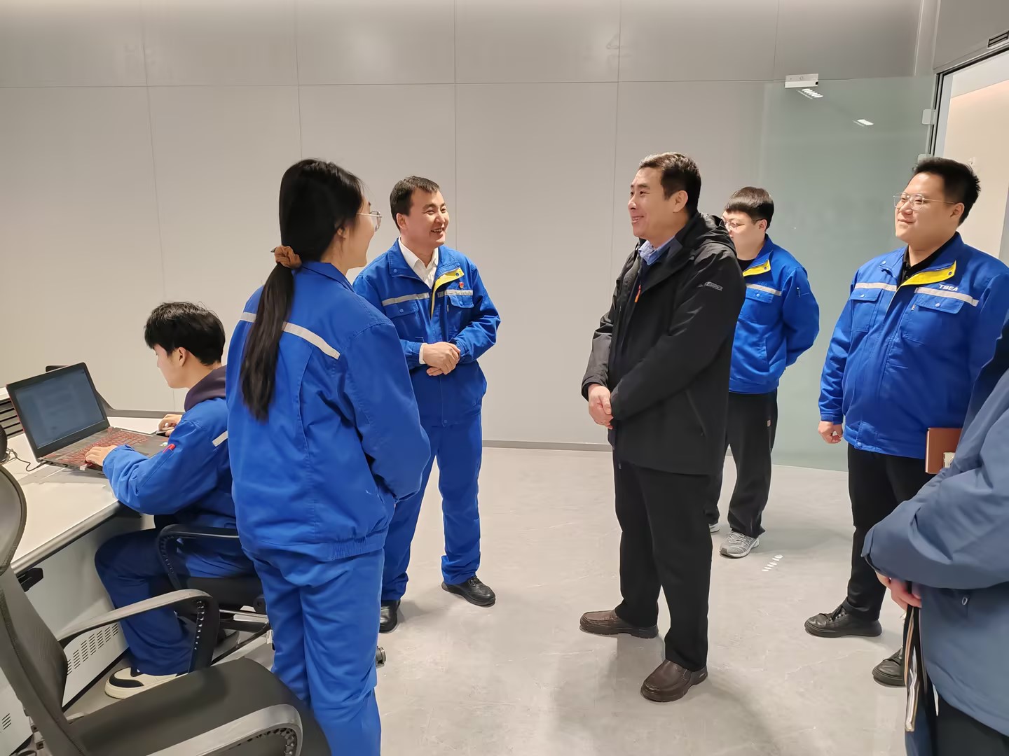 一行人还在京津冀智能科技有限公司副总经理马晓斌的陪同下,参观了特变电工京津冀产业园的数字化生产制造体系和零碳管理的情况。并实地探望了在此工作实习的学生,深入了解学生在岗位上的工作内容、技能运用及生活保障情况。在与学生的亲切交流中,杨理连校长仔细询问了大家的实习心得与职业规划,对同学们立足岗位勤学苦练、快速融入企业生产节奏的表现给予充分肯定。