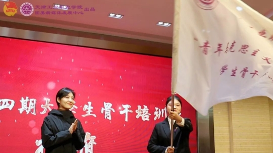 学院党委学生工作部副部长杨笑为第十四期大学生骨干培训班授旗。